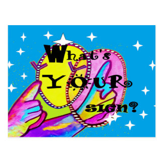 The second image is a colorful, artistic poster with a hand holding a mirror that reflects the word 'Sign'. The poster has a blue background with a starry sky effect and is adorned with various colorful paint splatters. The text 'What's Your Sign?' is written in a playful, cursive font above the mirror, and the word 'S... | What's Your Sign Postcard | a10ed7a00622b2f93c76101dcfcd8f4873ada28fad7f9a199c7808f36f239626 | 001229697185 | 0 | 0 | 82 | 4 | 0 | 0 | |