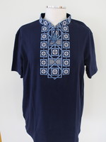 A navy blue t-shirt with a geometric pattern on the front is displayed on a white background. The t-shirt is hanging on a mannequin, and the pattern consists of various shapes and lines in shades of blue and white. The t-shirt appears to be a casual, short-sleeved design. | Navy T-shirt with Blue-White Embroidery | 5fe81dcda2abded9a6cebcebe8a062f2c647948275fa7b0f87a50b4987c7fbd3 | 001229697533 | 0 | 0 | 48 | 5 | 0 | 0 | |