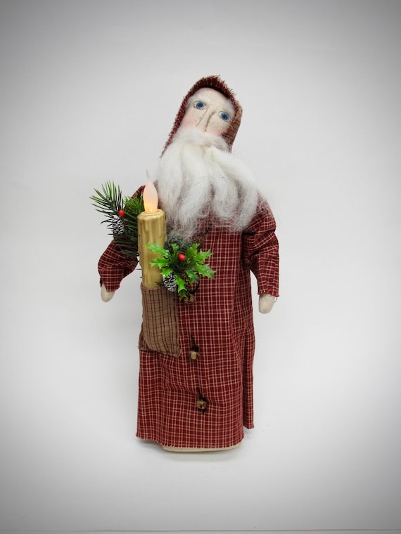 A small, intricately designed wooden figurine of Santa Claus stands against a white background. Santa has a white beard, a red and white checkered coat, and a green hat. He is holding a lit candle in his left hand and a bouquet of greenery with red berries in his right hand. | image 0 - Primitive Country Christmas Decorations | f38a1b0c2d3686be709f5e6bb5218052a74a95758f802873b93b5e80a5291a07 | 001229697413 | 0 | 0 | 51 | 7 | 0 | 0 | |