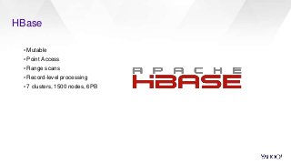 The second image is a presentation slide with a white background and a large, bold red and white text that reads 'APACHE HBASE'. Below the text, there are four bullet points with descriptions of the features of Apache HBase. The bullet points are in a smaller font and are arranged vertically. The first bullet point is ... | HBase\n\xe2\x96\xaa Mutable\n\xe2\x96\xaa Point Access\n\xe2\x96\xaa Range scans\n\xe2\x96\xaa Record-level processing\n\xe2\x96\xaa 7 clusters, 1500 nodes, 6PB\n | 8b80e53b12e91dc909a2130dd4503979417bc8b308797c76ea0df01851fc8ac3 | 001229697531 | 0 | 0 | 101 | 13 | 0 | 0 | |
