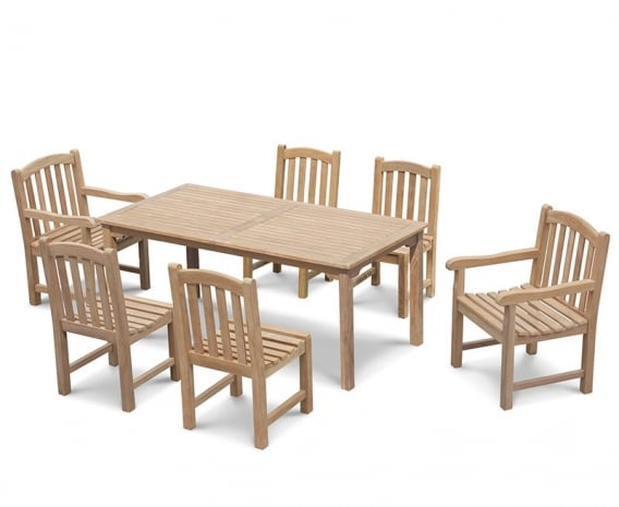 A set of six wooden chairs with vertical slats on the backrest and a flat wooden seat, arranged around a round wooden table with a flat top and a central pedestal base. The chairs and table are placed on a white background. | Sandringham 6 Seater Garden Table 1.8m with Clivedon Chairs | 92461ac9c761029cde1db023bcd5333ee08cec7f744511520f67de5d996d8824 | 001229697530 | 0 | 0 | 42 | 9 | 0 | 0 | |