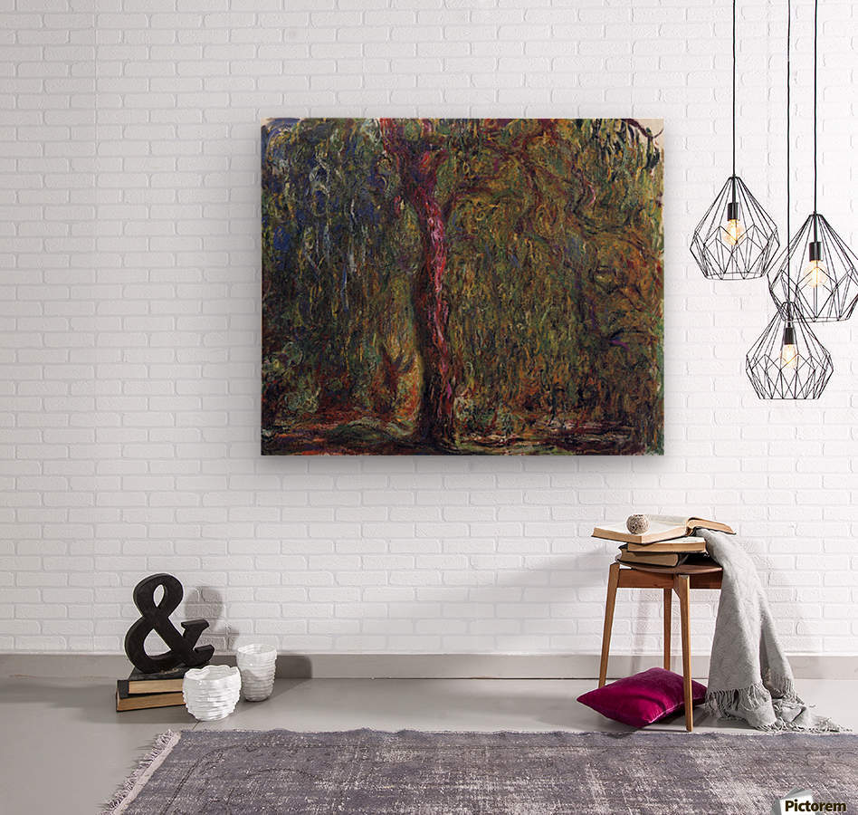 A modern living room with a large abstract painting on the wall, a small wooden side table with a stack of books and a vase, a gray throw blanket on the floor, and a geometric-patterned rug. | Weeping willow by Monet Wood print | a4163e78604d31cb4a9cabd7e7d8c56f1b3d015088d4439932d3cf8337262f08 | 001229697483 | 0 | 0 | 36 | 6 | 0 | 0 | |