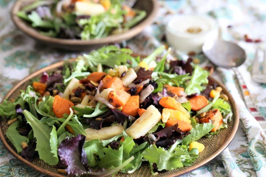 A bowl of mixed greens salad with various vegetables such as carrots, apples, and nuts is placed on a dining table. The salad is garnished with a sprinkle of red cabbage. There are two small bowls of dressing, one with a dollop of cream and the other with a spoon. A spoon rests on a napkin beside the bowl. | Roasted Harvest Vegetable Salad | 134d311afa549fb6a6043373231e65ed274288a37a0f94e9d16c51dcafb6f69a | 001229698265 | 0 | 0 | 59 | 4 | 0 | 0 | |