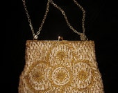 A close-up view of a handbag with a textured surface and a circular pattern in the center. The handbag is held by a chain with a clasp, and the background is dark, emphasizing the handbag's details. | Vintage Gold Beaded Clutch Purse, Hand Made | f29a29a9a0554b002ba466df15c3bef2abdb57174a3f3a81e24937e20dd31bd7 | 001229698273 | 0 | 0 | 36 | 7 | 0 | 0 | |