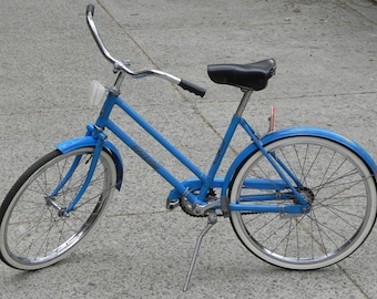 A blue bicycle with a black seat and handlebars is parked on a sidewalk. The bicycle has a white front wheel and a black rear wheel. The frame is metallic, and the bike has a kickstand. | Rare Raleigh Mountie Vintage Child's Bicycle, Blue, 20" Bike | 4f53fd5a992021d08fbc54b467dd07c3da242b8f4c1475ccad0c34348baec89d | 001229698531 | 0 | 0 | 36 | 9 | 0 | 0 | |