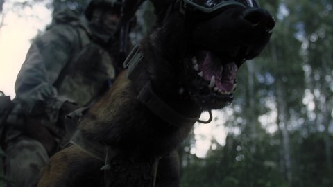 A close-up of a German Shepherd dog's face with a military soldier in the background. The dog is wearing a harness and appears to be in a forest setting. The soldier is partially visible, wearing a camouflage uniform and a helmet, and is also wearing a harness. The dog's mouth is open, and it appears to be panting or b... | Close-up, a military trained shepherd dog, in training in a dense deciduous forest, noticed the enemy. Military dog is ready to attack the enemy | ff551cd8d8bce387d31383b311753801ade7cc0714d701c738e7da3d0820ff67 | 001229699458 | 0 | 0 | 60 | 24 | 0 | 0 | |