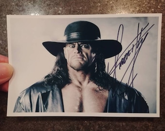A close-up of a person's hand holding a white card with a black and white image of a man with a scowl on his face. The man has long hair and is wearing a black hat. There is a signature in black ink on the card, which appears to be a celebrity's autograph. The card is placed on a surface with a speckled texture, and th... | Vintage retro The Undertaker WWF WWE wrestling wrestler 2000's photo picture color 4x6 | c5371a4e982e307b5dab03f13c7dbf33d9c0bbea1920c89995c4a431480306b6 | 001229699460 | 0 | 0 | 73 | 13 | 0 | 0 | |