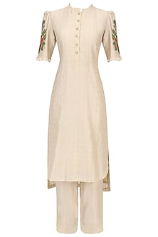 A beige traditional Indian kurta with a matching dhoti and a decorative green and red pattern on the left side of the kurta is displayed against a white background. | Beige Embroidered Kurta and Pants Set by Baavli | 82dbba618527666daef314e2a8f9777202bdcaf19e4d579b15f0cc625a0102e0 | 001229699156 | 0 | 0 | 29 | 8 | 0 | 0 | |