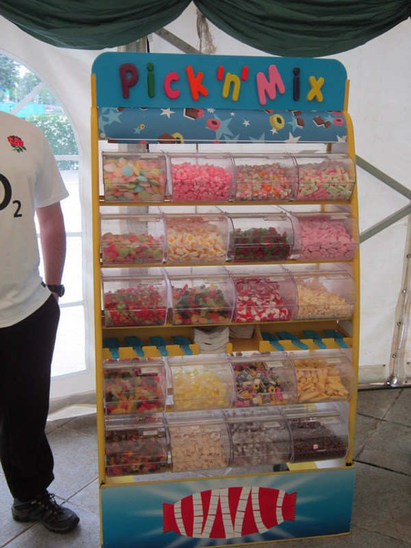 A man in a white shirt with a red rose logo stands next to a colorful candy display with various sweets in jars and a sign that reads 'Pick'n'Mix'. The display is under a tent with a green roof, and the scene appears to be set outdoors. | pick n mix hire london | ce310349c2ed62b445203678dd2ecfeca2b9fe0420273b63d2591064c968e571 | 001229699692 | 0 | 0 | 47 | 5 | 0 | 0 | |