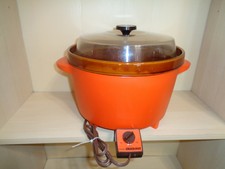 A vintage orange crockpot with a clear glass lid is sitting on a white shelf. The crockpot has a brown knob on top and a black control panel with buttons and a dial on the front. There is a white cord hanging down from the crockpot. | Vintage Rival Crock Pot Slow Cooker Stoneware 5 Quart Model 3300-2 | abc4c0e52e46536e65808dfce41a1786dacabff9c947e26762aba06c4a823e8d | 001229699879 | 0 | 0 | 46 | 11 | 0 | 0 | |