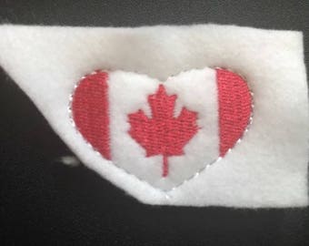 A close-up of a white fabric with a red maple leaf embroidered in the center. The leaf is detailed with visible veins and a pointed tip. The fabric appears to be part of a larger piece, possibly a flag or a decorative item, with the maple leaf design being the focal point. | UNCUT Canadian Leaf Feltie | 78ea6ba06a66afa84aca24cd12ebd4e63ae3952589c05c877708569513343f0a | 001229699688 | 0 | 0 | 52 | 4 | 0 | 0 | |