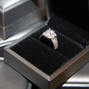 A diamond engagement ring with a large center stone and smaller accent diamonds is displayed on a black velvet cushion inside a silver ring box. | NEW Wedding Ring Silver Plated Zirconia Stones Size 6 ONLY SAME BOX Burtonsville for Sale in Burtonsville, MD | a51a3a956cc84c94d1ad5be272789386bd8ec874c4d08a785df2bd807bcb9026 | 001229699829 | 0 | 0 | 25 | 18 | 0 | 0 | |