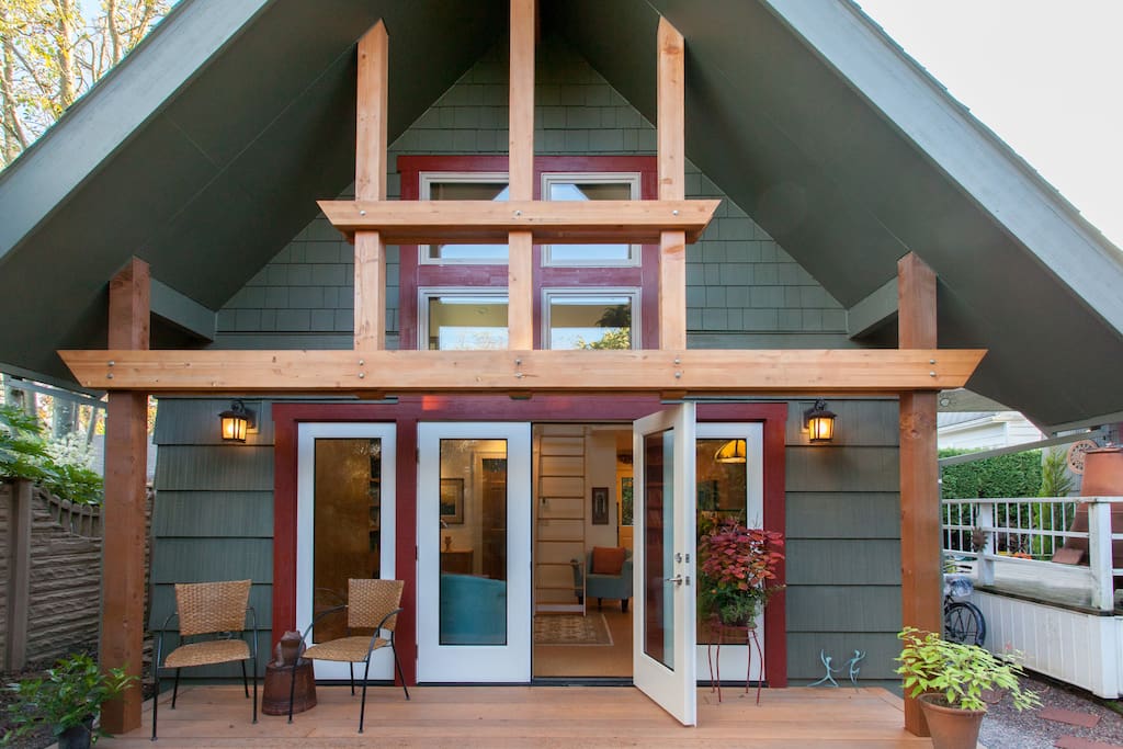 A modern house with a green roof and a red and white front door. The house has a wooden porch with a chair and a small table. There is a bicycle parked to the right of the house. | Our studio was designed by a Portland architect, who included a number of intriguing features. | cf1ea31c0b48a6b97d246d2ac7b25066c25f87211445bd9420d78ad172176c4f | 001229700896 | 0 | 0 | 38 | 15 | 0 | 0 | |
