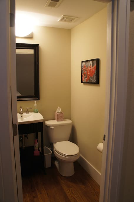 A small bathroom with a white toilet, a white sink with a black countertop, and a black trash can. There is a framed picture on the wall, a mirror above the sink, and a light fixture on the ceiling. The floor is wooden, and there are cleaning supplies on the countertop. | half bath off of main living space | dbf6ec03a652f3267815acb140212e3f9e7819f4af79afbbc170c5630172f54b | 001229700848 | 0 | 0 | 51 | 7 | 0 | 0 | |