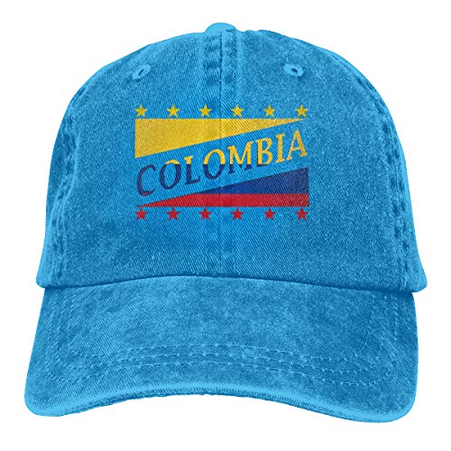 A blue baseball cap with a yellow and red embroidered patch featuring the word 'Colombia' in white letters, surrounded by a yellow star and red stripes. | Osmykqe New Colombia Flag Football World Cup Denim Blue Washed Cotton Adjustable Twill Low Profile Plain Unisex H\xc3\xbcte | 941204f568b9593c78a4aac38779599d507a1ebea9ca472e3e8dcbdaa6c37d3e | 001229700960 | 0 | 0 | 26 | 18 | 0 | 0 | |