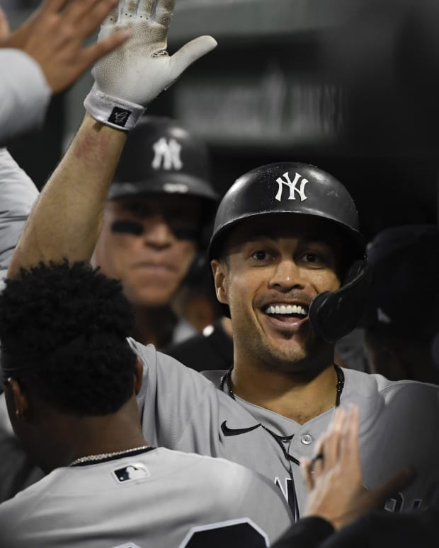 A baseball player is celebrating a win with his teammates. He is wearing a baseball cap, a jersey, and a baseball glove. His teammates are surrounding him, congratulating him with high-fives and smiles. The player is holding a microphone, possibly for an interview or to address the crowd. | Yankees Giancarlo Stanton and Aaron Judge celebrate in dugout | 38fc07b085526b879c8d40c4c41e6761d34165a6d7e5efd55656600453a695e0 | 001229701032 | 0 | 0 | 48 | 9 | 0 | 0 | |