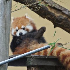 A red panda is sitting on a wooden platform with a metal bar running across it. The red panda is holding onto a branch with its front paws and appears to be grooming itself. The background is a plain wall with a wooden beam running horizontally across it. | Asahiyama Zoo User Photo | c0c1df2c58a74e481f5cc0d2094d6f171ef08a13a3645bd1ffacbca0e0d73a5f | 001229701324 | 0 | 0 | 48 | 4 | 0 | 0 | |