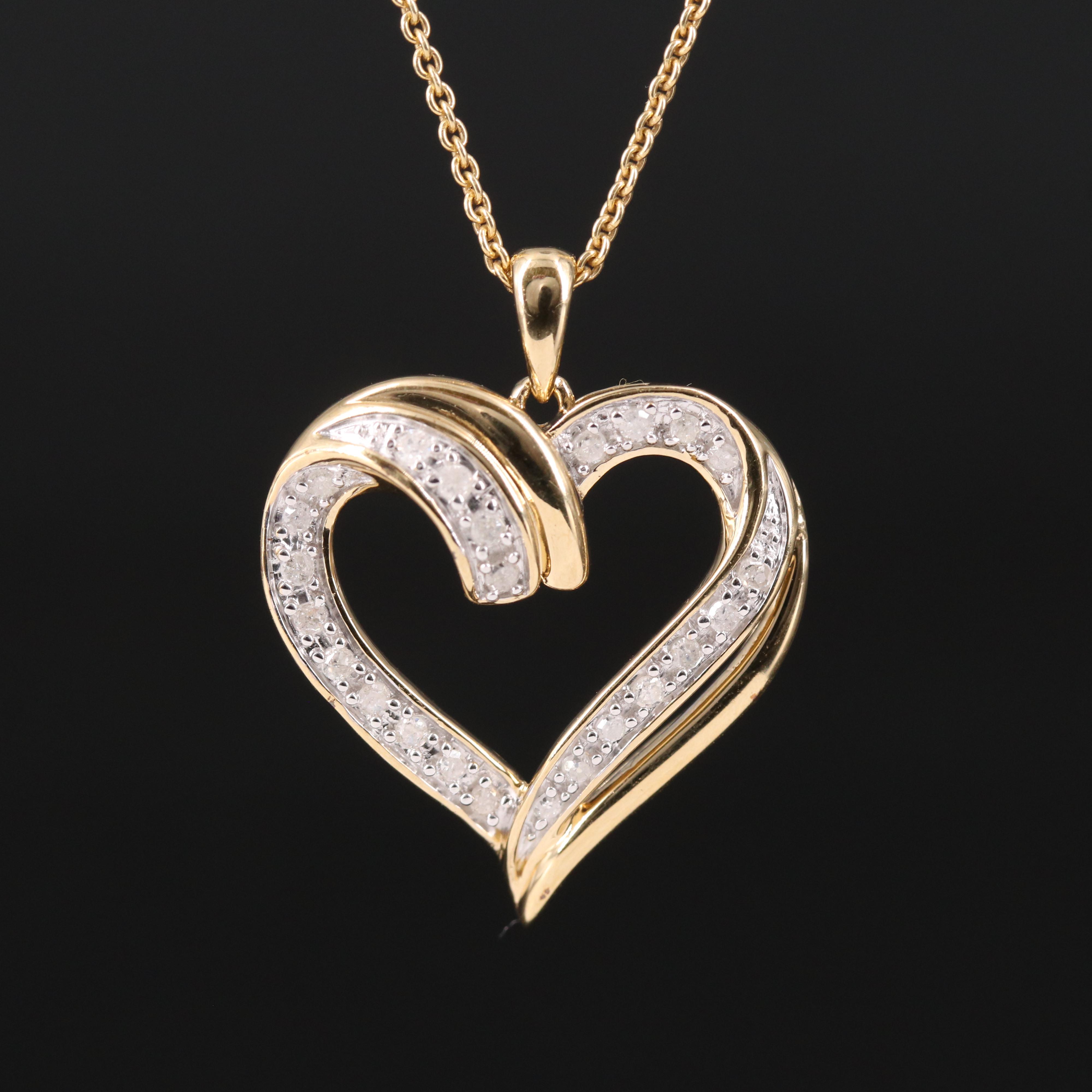 A gold heart-shaped pendant with a diamond in the center and smaller diamonds along the edges is displayed against a black background. | Sterling Diamond Heart Pendant Necklace | 401e215f83378f262e457b6246225a5d76bd33eea9b3a85b16fad61ec6082dd9 | 001229701259 | 0 | 0 | 22 | 5 | 0 | 0 | |