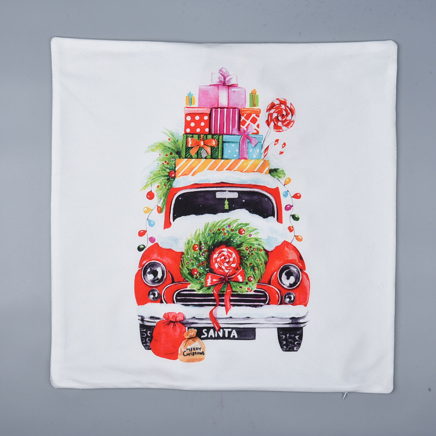 A white cloth napkin with a festive Christmas design featuring a red car adorned with a wreath, holly, and a 'Santa' license plate. The car is decorated with a large bow on the front, and there are various Christmas-themed items such as gifts, candy canes, and a candy cane wreath. The background is a plain light color. | Christmas Theme LED Cushion Cover with Filling (Size 45 Cm) - White & Multi - Requires 2AA Batteries (not Incld) | dcdcb55f236fe9fd46682ebd59da252a757c93b4235d18f10fbcf3a4b157253b | 001229701258 | 0 | 0 | 57 | 20 | 0 | 0 | |