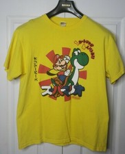 A yellow t-shirt with a cartoon character design featuring Mario and Yoshi from the Super Mario Bros. series is hanging on a hanger. The character is depicted in a dynamic pose with Mario holding a mushroom and Yoshi in the background. The shirt has Japanese text on the left side and a red and white circular emblem in ... | 2009 Super Mario World Yoshi Nintendo SNES T-shirt Size Mens LG Japan | b5976345fd2cd2200b83f4237a9a9e77cd652da578b88cb21f8bf6253cb945cd | 001229701465 | 0 | 0 | 60 | 12 | 0 | 0 | |