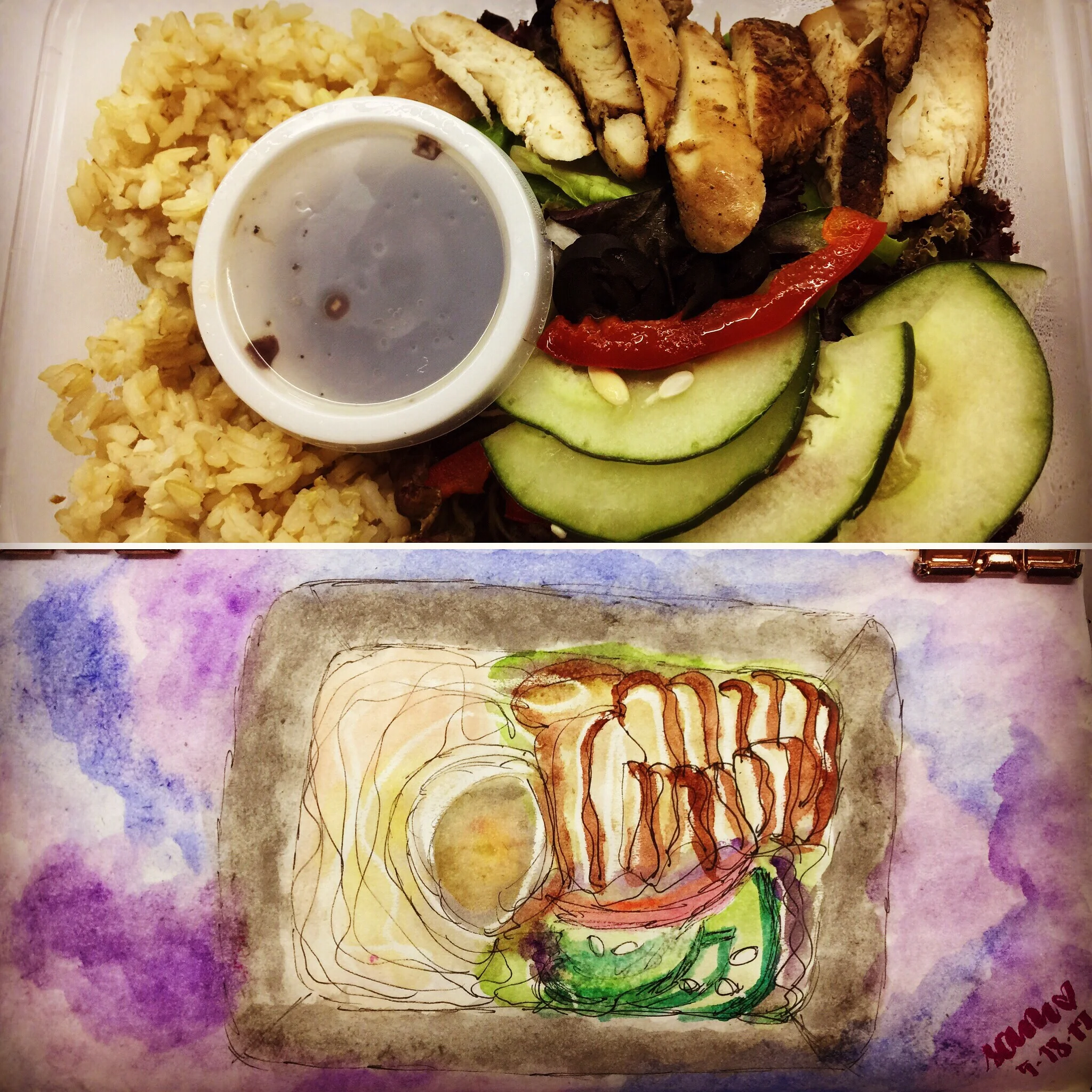 A colorful drawing of a salad with various vegetables such as lettuce, cucumber, tomato, and peppers, accompanied by a bowl of rice and a side of meat, all presented in a white container. | Drawing my Lunchboxdiet dinner last night | aacb14c2f9e8f693d84ee50230378ce49b6fdbb753be6f08f6b6f7ea23b2d30f | 001229701356 | 0 | 0 | 33 | 6 | 0 | 0 | |