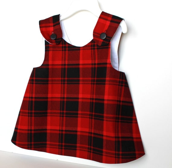 A red tartan plaid dress with a white collar and short sleeves, featuring black buttons and a white undershirt, is displayed on a white background. | Children Fashion. Back To School. Lined Pinafore Apron Shirt in Red & Black Plaid. 12 Months and Up. Autumn Fashion. Girls Clothes. Top. | d8341d2f14233278a8b33c3b1fd1534d50b5a3c3993b9b928746ebaea91baae2 | 001229701184 | 0 | 0 | 25 | 23 | 0 | 0 | |
