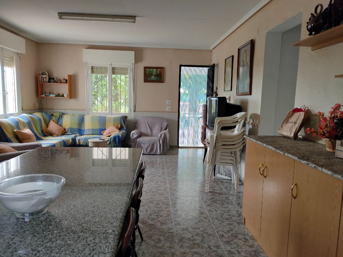 A spacious living room with a large window, a blue and yellow striped sofa, a beige armchair, and a dining table with a bowl on it. The room has a tiled floor and a kitchen area with a countertop and cabinets. There are also two chairs with a table in the kitchen area. | For sale of chalet in Monforte del Cid | 023c48c0a6b7a233abdbb2e9f837a829201a9143442b00b3c231b22f64b99f66 | 001229701429 | 0 | 0 | 53 | 8 | 0 | 0 | |