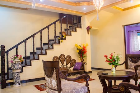 A living room with a wooden staircase, a wooden chair with a floral pattern, a small wooden table with a vase of flowers, and a decorative rug on the floor. | 2BHK decent apartment for peaceful long/short stay - Bungal\xc3\xb3 | f610405394b42ea481949c2f07a51dddf0735de860a14ee3a3e816c8e6e88bd6 | 001229701709 | 0 | 0 | 30 | 9 | 0 | 0 | |