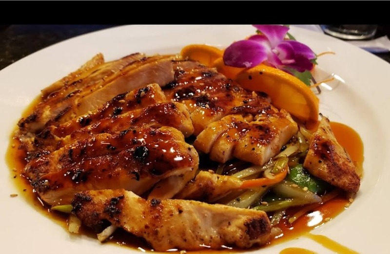 A close-up view of a plate with a piece of meat covered in a sweet and sour sauce, accompanied by a small pile of sliced carrots and a purple flower. The plate is on a dining table, and the lighting highlights the textures and colors of the food. | 1. Chicken Teriyaki Image | ddca08f55cc072862d8c97fc89f8c0658a40e1fb55ec93e1ac9fd9205a85aa72 | 001229701776 | 0 | 0 | 48 | 4 | 0 | 0 | |