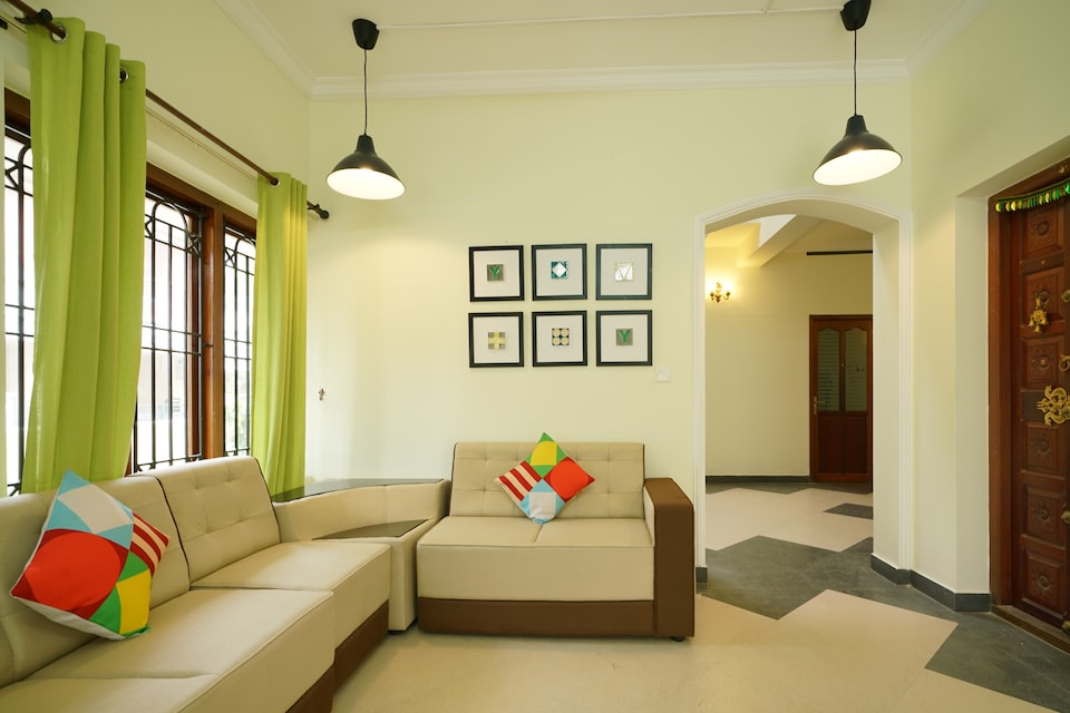 A modern living room with a beige sofa adorned with colorful pillows, a wooden coffee table, and a framed picture gallery on the wall. The room has a green curtain, a white ceiling with hanging lights, and a checkered floor. | OYO Home 35489 Lavish Stay Near Rose Garden | e42b7c43855b4be717bb9e528a9f0a7c89063c9d1f97109f9829f4af1c9902e7 | 001229701546 | 0 | 0 | 40 | 8 | 0 | 0 | |