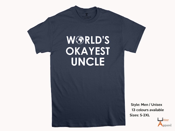 A dark blue t-shirt with a graphic design that reads 'World's Okayest Uncle' in white text. The design features a stylized globe with a smiley face and a speech bubble. The t-shirt has a ribbed collar and is shown in a men's size with a tag indicating a size 'S' and a style 'Men's'. The tag also shows a color palette w... | Uncle t shirt Christmas gift, worlds okayest uncle new uncle t shirt gift birthday gift, shirt uncle tee gift from nephew, gift from niece | 82ed56c388b04480fb6cb2f54253a726eac37d453d0d3eecdb4c4fa1f424969f | 001229701664 | 0 | 0 | 85 | 24 | 0 | 0 | |