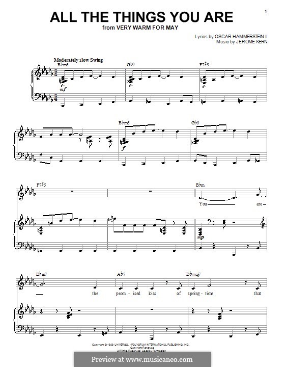 A musical score with the title 'All the Things You Are' from the musical 'Very Warm for May'. The score is in black and white, with musical notes and lyrics. The lyrics are in English and are placed above the musical notes. The score is attributed to Oscar Hammerstein II and is part of a larger collection of sheet musi... | Piano-vocal version: For voice and piano (Ella Fitzgerald) by Jerome Kern | 79881130b7416861ad9e37cbd9e6aada83e01a65b89ecb4f5c201c59a1dcfbd4 | 001229701721 | 0 | 0 | 60 | 11 | 0 | 0 | |