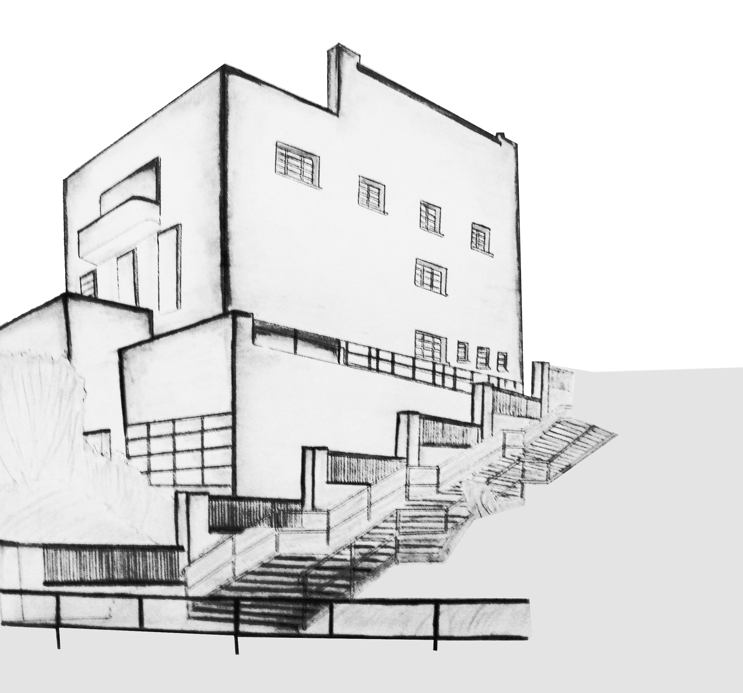 A black and white sketch of a modern building with a flat roof, featuring a series of rectangular windows and a staircase leading to the entrance. The building is set against a plain background with a few lines suggesting a sky or horizon. | Muller House - Drawing | 8d7755e6d4500883692cae7489d48b31970aebd7778db5d0322e59b716996bbc | 001229701838 | 0 | 0 | 43 | 4 | 0 | 0 | |