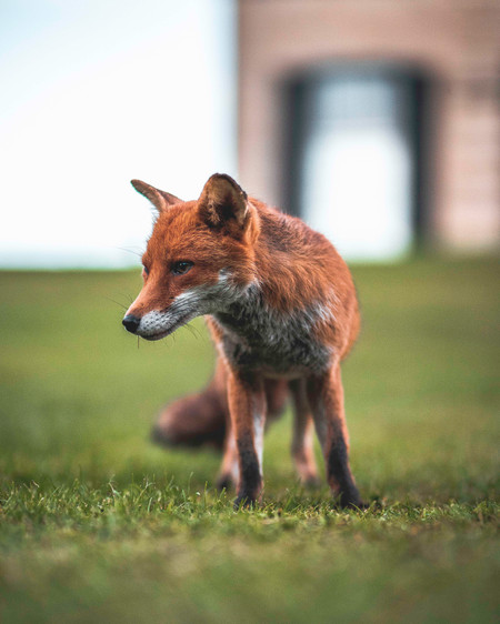 A red fox is standing on a lush green lawn with its head turned to the side, looking towards the camera. The fox has a bushy tail and pointed ears, and its fur is a mix of red, orange, and white. The background features a building with a large arched doorway, and the sky is clear and blue. | Urban Fox | f343a1074f13023650a70458c9aa508eac7a9fd980db6c9299dd240ec4100f3b | 001229701905 | 0 | 0 | 58 | 2 | 0 | 0 | |