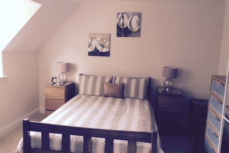 A cozy bedroom with a sloped ceiling, featuring a bed with striped bedding and a wooden headboard. Above the bed, there are two framed pictures of white flowers. To the left of the bed, there is a wooden nightstand with a lamp and a small vase. To the right, there is another wooden nightstand with a lamp and a small va... | Ensuite Room in Newly built house - Clifton | 287b8d659d6d20f52a2b1cc573ed84fe29c3b649fcb769732e02802356f84558 | 001229702003 | 0 | 0 | 76 | 8 | 0 | 0 | |
