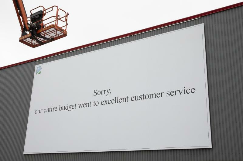 A large billboard with a white background displays the text 'Sorry, our entire budget went to excellent customer service.' The billboard is mounted on a building with a grey metal wall. Above the billboard, there is a cherry picker with an orange and black color scheme, and a person is visible inside the cherry picker. | Excellent billboard via /r/funny #funny #lol #haha #humor #lmao #lmfao #hilarious #laugh #laughing #fun #wacky #crazy #silly #witty #joke #jokes #joking #epic #funnypictures | bb129ba244fa6ff87b797ac8597872d70a390919b692d4867f235b777898ce37 | 001229702422 | 0 | 0 | 55 | 23 | 0 | 0 | |