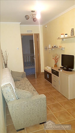 A cozy living room with a beige sofa, a wooden coffee table, and a flat-screen TV mounted on the wall. The room has a warm color scheme with yellow walls and a terracotta tiled floor. There is a small balcony with a railing and a potted plant on it. The ceiling has a ceiling fan and a light fixture. | Cozy beautiful apartments near St. James Way to Fisterra, Dreizimmerwohnung (67716), 016 | 07ccf346fa2618af4302d8f2f705642bf42bdd300b1219b7fd661688990f4221 | 001229702398 | 0 | 0 | 59 | 12 | 0 | 0 | |