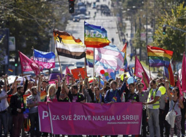 A large crowd of people is marching down a street, holding various colorful flags and banners. The flags include rainbow, pink, and blue, while the banners have text in a foreign language. The crowd is dense, with many individuals visible, and the street is lined with trees and traffic lights. The atmosphere appears to... | Belgrade Pride | f64c8adeadef8bad6a87e6265f266958aff2410348233d014be66b103d030dcf | 001229702385 | 0 | 0 | 58 | 2 | 0 | 0 | |