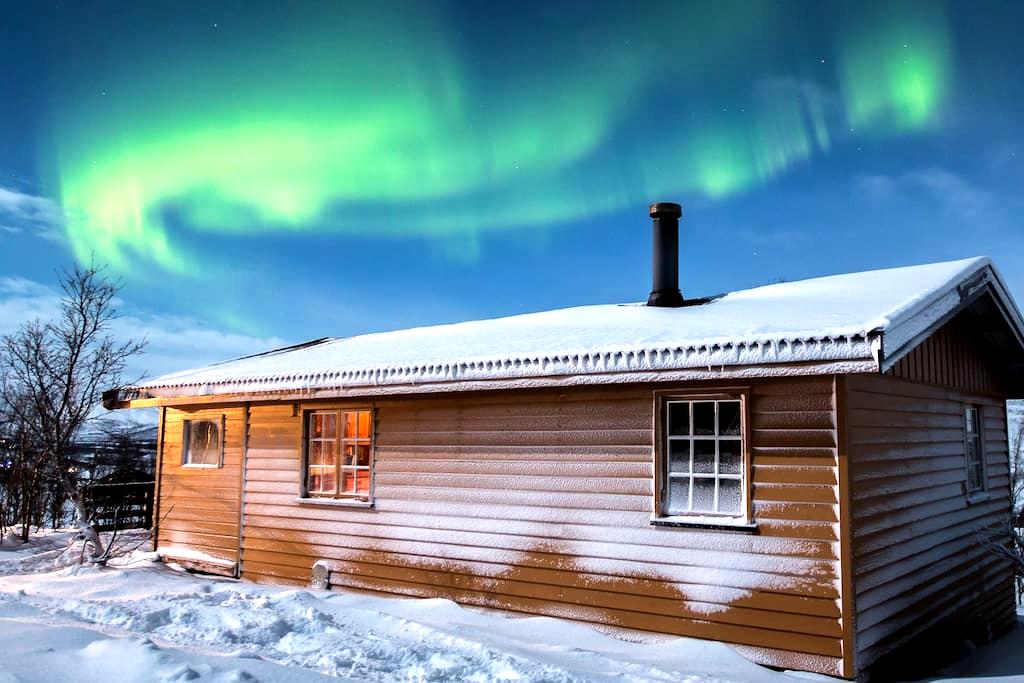 A small wooden cabin with a snow-covered roof is illuminated from within, casting a warm glow through the windows. The cabin is surrounded by a snowy landscape, and the night sky above is filled with the vibrant green and purple hues of the aurora borealis. | Cozy cabin, perfect for watching aurora borealis - Kvalsund | c08855e28e72942adf9e4ce6f5b8daebf168526e5a5a56ebd674b5e1f424b0bd | 001229702926 | 0 | 0 | 45 | 9 | 0 | 0 | |