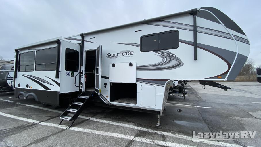 A white and black recreational vehicle is parked in a lot with a clear sky above. The RV has a large window on the side, a door with a step leading up to it, and a ladder on the back. The ground is wet, and there are puddles around the RV. The license plate reads 'SOLUCIDE'. | 2021 Grand Design Solitude S-Class | fabee1f22e86632c7821ad950d3eb0fc229f3e37356e43deb80a08f8fb0a7661 | 001229702919 | 0 | 0 | 56 | 5 | 0 | 0 | |