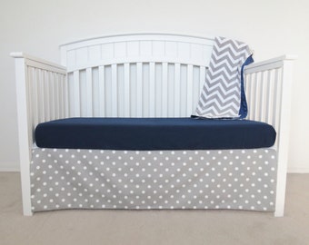 A white crib with a blue cushioned mattress and a blue and white striped blanket draped over the side. The crib is placed on a beige carpeted floor. | 3 Piece Crib Set - Polka dot and chevron crib set | c731e1de74163557457ab99682a28d98f2c4e1860ffd50a32184a799fc5738c3 | 001229702977 | 0 | 0 | 28 | 11 | 0 | 0 | |