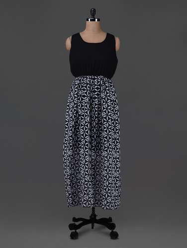 A black dress with a fitted bodice and a flared skirt featuring a pattern of white and black geometric shapes is displayed on a mannequin. The dress has short sleeves and is accessorized with a black belt. The mannequin is positioned on a turntable with a black base, and the background is a plain, light gray color. | Black Printed Georgette Maxi Dress - G&M Collections | 6c3b0464a3893bfda5647b00dc981b5e943a65b2126b2da2c1623b3d15392c0a | 001229702797 | 0 | 0 | 57 | 8 | 0 | 0 | |
