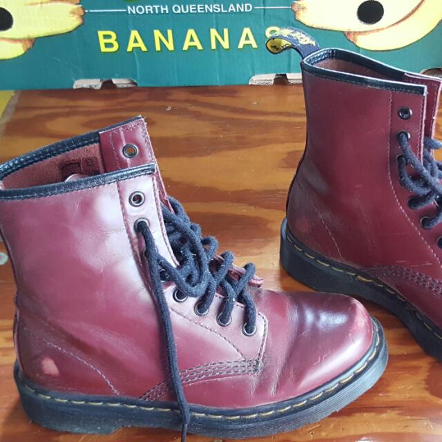 A pair of red high-top boots with blue laces is placed on a wooden surface. The boots are positioned side by side, with the left boot slightly in front of the right one. The boots have a shiny finish and are made of leather. The background features a cardboard box with the words 'NORTH QUEENSLAND BANANA' written on it. | Trendy Ladies Distressed Burgundy Doc Martins Sz 6 Never Worn | 36f5620d0e7462d6f02404aa4356a550ed51e42b07493339693f55e37c7e0ddd | 001229702907 | 0 | 0 | 59 | 10 | 0 | 0 | |