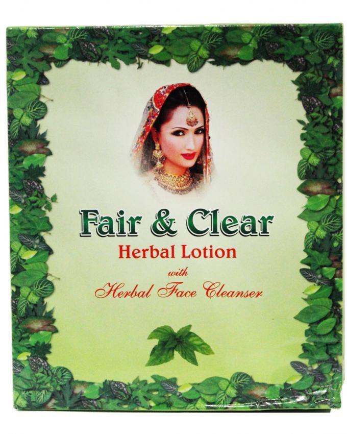 A product packaging with a woman's face on it, surrounded by green leaves. The text 'FAIR & CLEAR' is prominently displayed at the top, followed by 'HERBAL LOTION' and 'WITH HERBAL FACE CLEANSER' below it. The packaging has a green background with a decorative border of green leaves around the edges. | Pack of 2 - Fair & Clear Herbal Lotion + Face Cleanser | ae35e083ceab3d559774c5b9483942499c9a8269cd162c61ca41f2b8fcc31225 | 001229703002 | 0 | 0 | 51 | 12 | 0 | 0 | |
