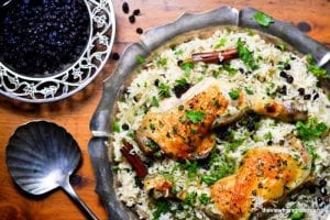 A dish of chicken and rice is served on a wooden table, garnished with parsley and accompanied by a small bowl of black beans and a spoon. | Ottolenghi's Chicken with caramelized Onions and Cardamom Rice | 5fa6dc8aca64b2a3252ce562f20029491e25b73e72bbb6602954547b95aa0f9f | 001229703022 | 0 | 0 | 27 | 8 | 0 | 0 | |