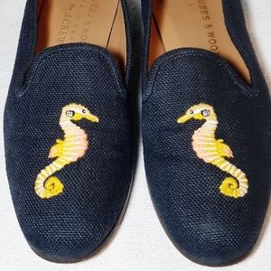 A pair of black canvas shoes with yellow and white embroidered seahorses on the sides. The shoes have a blue interior lining and are placed on a white surface. | Stubbs & Wooton Linen Loafers for J. Crew (7) EUC | ef71620a6ae3bae8de2c040a717d3032ed30e0e1aecbb5b6d163f1002536a348 | 001229703276 | 0 | 0 | 29 | 10 | 0 | 0 | |