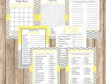 A set of baby-themed bingo cards and score sheets are displayed on a wooden surface. The bingo cards have a yellow and white chevron pattern and are labeled 'Baby Shower Bingo'. The score sheets are also yellow and white with chevron patterns and have titles such as 'Baby Bingo Scramble', 'Baby Bingo Jeopardy', and 'Ba... | Baby Shower Games Pack Yellow Grey Chevron Mommy to be PRINTABLES INSTANT Download bingo word find whats in your purse - 1010 | cdb8aa2043564a6d8ccdf4155ace8b1c6f7a352ab4730518187502f152750cdb | 001229703206 | 0 | 0 | 82 | 22 | 0 | 0 | |