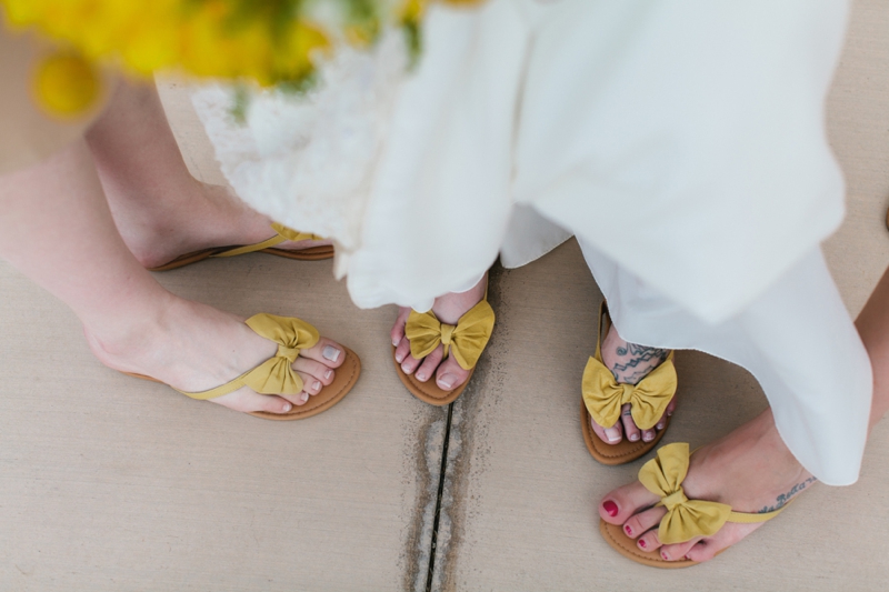 The first image shows two women standing side by side, with their feet visible. They are wearing yellow sandals with white bows on the toes. The woman on the left has a tattoo on her right ankle, and the woman on the right has a tattoo on her left ankle. Both women are wearing white dresses that appear to be flowing, a... | Yellow and White Air Force Wedding via TheELD.com | d266bf8196b31329f9eaefe84be078bfc7f433f5343d3430396d3e6b935e8f3b | 001229703193 | 0 | 0 | 71 | 8 | 0 | 0 | |