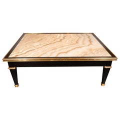 A wooden table with a glossy finish and a unique wood grain pattern is displayed against a white background. The table has a black frame with gold accents and is positioned on a light-colored floor. | Modernist Black Lacquer and Bronze Cocktail Table with Onyx Top & Bronze Mounts | d6b06d4c36c2473094a9faea24a69ad42c6a548366c6ec1978c56a2776fd5fd1 | 001229704302 | 0 | 0 | 35 | 13 | 0 | 0 | |