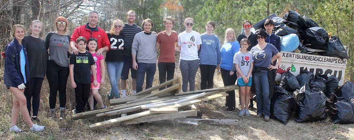 A group of people is standing in front of a pile of trash bags, with a wooden structure in the foreground. The group consists of individuals of various ages, some wearing casual clothing and others in more formal attire. The background features a forested area with trees and a clear sky. | Kent Island Beach Cleanups | 39566fd98bd55a75c91bf1456f70d1ca2cbd15b42c13e3b74eeec4bb852d0da0 | 001229704257 | 0 | 0 | 51 | 4 | 0 | 0 | |